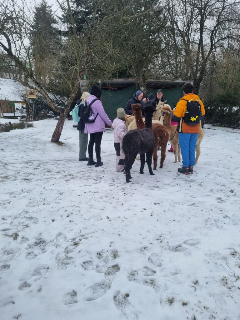 Am ersten Projekttag der Winterferien erlebten wir eine besondere Begegnung mit Alpakas. Nach einer Einführung im Umgang mit den Tieren ging es gemeinsam auf Wanderung.